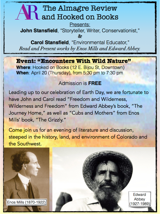 Come join us for our second literary salon in anticipation of Earth Day. Thursday afternoon (5:30 pm to 7:30 pm), John and Carol Stansfield will read authors Edward Abbey and Enos Mills, downtown @ Hooked On Books. Admission is FREE!